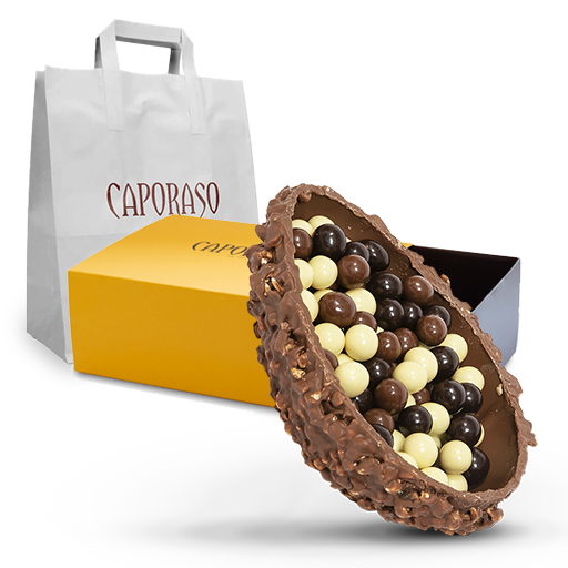 Il Mezzo Uovo di Pasqua farcito di Caporaso: il tradizionale uovo di cioccolato al latte nocciolato (400g), immancabile durante le feste di Pasqua, aperto nel mezzo e farcito con un mix di 400g di nocciole ricoperte al cioccolato (al latte, fondente e bianco).